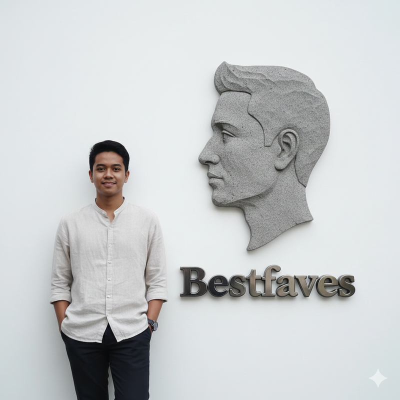 A handsome Indonesian youth stands leaning against a white wall. Beside him is a grey stone silhouette forming his face on the white wall. Below the silhouette is a 3D inscription "Bestfaves" with appropriate lettering.